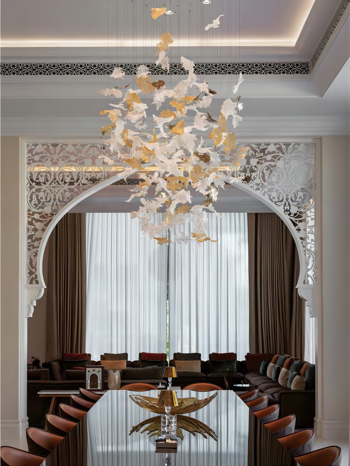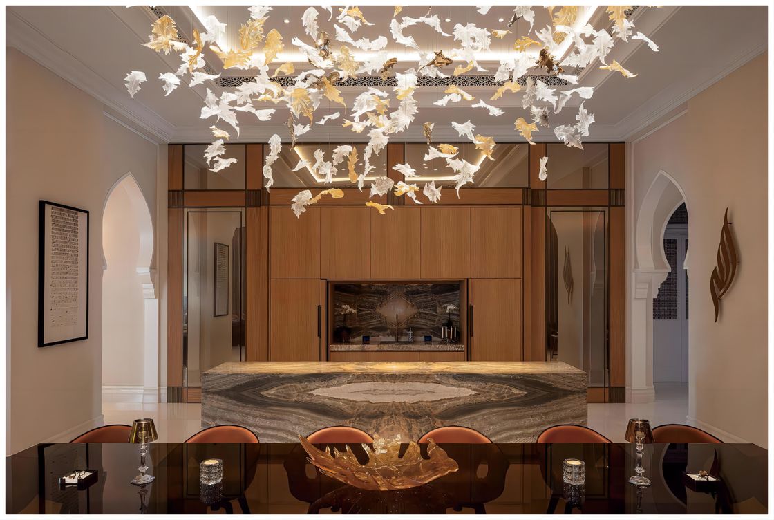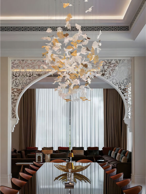 Dekorasi seni:Lampu gantung daun maple ini bukan hanya perangkat pencahayaan, tetapi juga bagian dari dekorasi seni aula perjamuan. Liontin daun maple kaca memancarkan efek cahaya dan bayangan yang mempesona di bawah cahaya, menciptakan suasana romantis dan hangat di aula perjamuan dan meningkatkan kualitas dan kelas suasana keseluruhan.